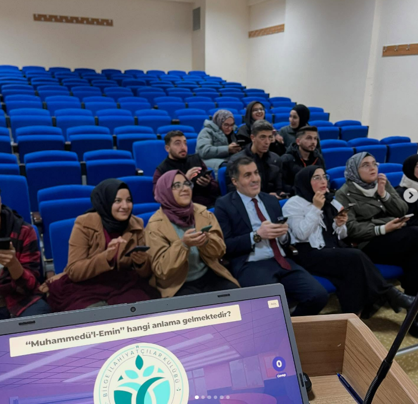 Üniversitemiz Sağlık Kültür ve Spor Daire Başkanlığına bağlı Bilge İlahiyatçılar Kulübü, İBEF Wilhelm Radloff Konferans Salonu’nda “Kahoot Temel Dini Bilgiler Yarışması” düzenledi. Tüm üniversite öğrencilerinin katılımına açık olan etkinlik, yüksek ilgi ve coşkulu bir atmosferle gerçekleşti. Kulübün danışmanı Doç. Dr. Taha YILMAZ da programa katılarak öğrencilere destek verdi. Yarışma süresince eğlenceli ve neşeli anlar yaşandı; öğrenciler hem bilgilerini ölçtü hem de keyifli bir rekabet ortamında birbirleriyle yarıştı. Programın sunumunu bizzat Kulüp Başkanı Cengiz KAYA yaptı. Yarışmayı organize eden ve tüm hazırlıkları yürüten Cengiz KAYA’nın emekleri, katılımcılar tarafından da memnuniyetle karşılandı. Yarışma sonunda dereceye giren 1., 2. ve 3. öğrencilere hediyeleri, kulüp danışmanı Doç. Dr. Taha YILMAZ tarafından takdim edildi. Ardından Doç. Dr. Taha YILMAZ, yarışmanın hazırlanmasındaki özverili çalışmaları dolayısıyla Kulüp Başkanı Cengiz KAYA’ya katılım belgesi vererek teşekkürlerini iletti. Etkinlik, toplu fotoğraf çekimleri ve katılımcıların tebrikleriyle son buldu. Bilge İlahiyatçılar Kulübü, benzer etkinliklerin devam edeceğini belirterek tüm öğrencilere teşekkür etti.