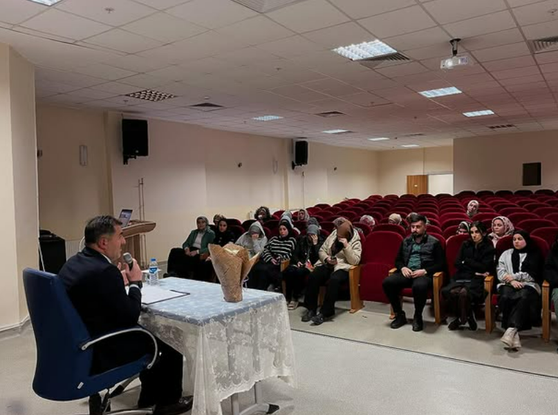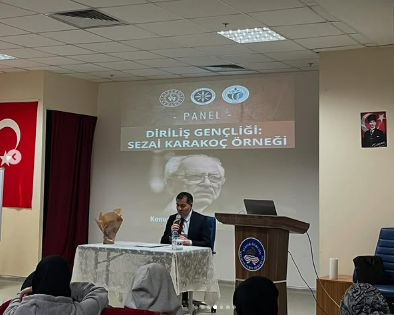 Fakültemiz Bilge İlahiyatçılar Kulübü tarafından düzenlenen “Diriliş Gençliği: Sezai Karakoç Örneği” panel dizisinin ilk oturumu, 25 Kasım 2025 Salı günü KYK Niyazi Mısri Kız Öğrenci Yurdu’nda gerçekleştirildi. Panelin konuşmacısı Doç. Dr. Taha YILMAZ, Sezai Karakoç’un diriliş düşüncesini, medeniyet tasavvurunu ve gençliğe yönelik mesajlarını ele aldı. Ayrıca Karakoç’un dini ve fikrî yönleri üzerine değerlendirmelerde bulunarak öğrencilerin sorularını yanıtladı. Etkinliğe Bilge İlahiyatçılar Kulübü Başkanı Cengiz Kaya, yurt idare personeli ve yurt manevi danışmanı da katılarak programa destek verdi. Öğrencilerin ilgiyle takip ettiği panel, samimi bir atmosferde gerçekleşti. Program, yurt öğrencilerinin Doç. Dr. Taha YILMAZ’a çiçek takdim ederek geçmiş Öğretmenler Günü’nü kutlaması ile sona erdi.