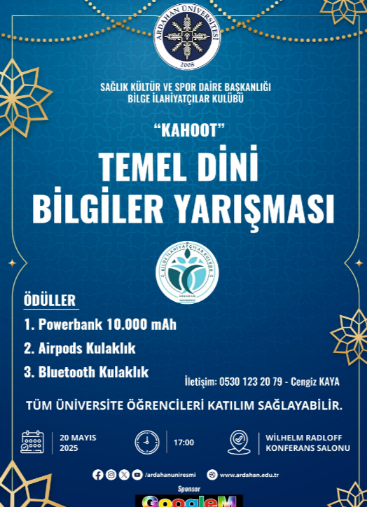 20 Mayıs 2025 tarihinde Fakültemiz Bilge İlahiyatçılar Kulübü tarafından organize edilen “Temel Dini Bilgiler Yarışması”, farklı fakültelerden öğrencilerin katılımıyla gerçekleştirildi. Bilgi dolu ve keyifli anların yaşandığı yarışma, öğrencilerin kaynaşmasına ve dini bilgi düzeylerinin artmasına katkı sundu. Program, kulüp danışman hocası ve aynı zamanda Fakültemiz Dekan Yardımcısı Dr. Öğr. Üyesi Taha YILMAZ’ın açılış konuşmasıyla başladı. Konuşmasında yarışmanın öğrenciler için önemine değinen Dr. Öğr. Üyesi Taha YILMAZ, bu tür etkinliklerin katılımcıların bilgi düzeylerinin artmasına katkı sağlamakla birlikte birlik ve beraberliği de pekiştirdiğini vurguladı. Yarışma kuralları hakkında bilgilendirmeyi ve yarışmanın koordinasyonunu Fakültemiz öğrencisi ve Bilge İlahiyatçılar Kulübü temsilcisi Cengiz KAYA üstlendi. Sunumu ve organizasyonuyla programın düzenli ve akıcı bir şekilde ilerlemesini sağladı. Ardahan’ın yerel firmalarından GOOGLEM, yarışma ödüllerine sponsor olarak etkinliğe katkıda bulundu. Yarışma sonunda dereceye giren öğrencilere; 1.’ye Sonuç / Kazanım Fotoğraflar etkinliğe katkıda bulundu. Yarışma sonunda dereceye giren öğrencilere; 1.’ye powerbank, 2.’ye AirPods kulaklık, 3.’ye ise Bluetooth kulaklık hediye edildi. Katılımcılara ve destek veren herkese teşekkür edilerek program sona erdi.